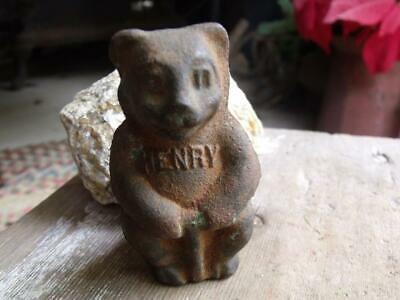 Small Old Primitive Vintage Cast Iron Bear Figure HENRY Holding Dynamite Plunger