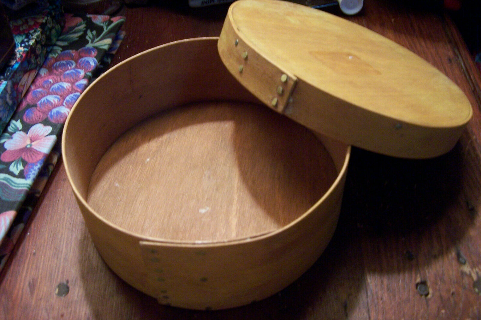 Title (ebay affiliate link): 5.75" x 2.75" Wood Pantry Box with Brass nails, Round. Primitive
