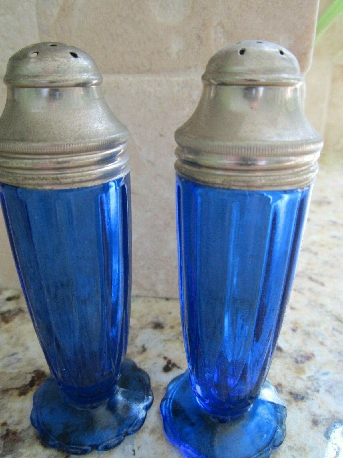 Title (ebay affiliate link): Cobalt Blue Depression Glass Salt + Pepper Shakers Pedestal Ribbed Fluted 4 1/2"