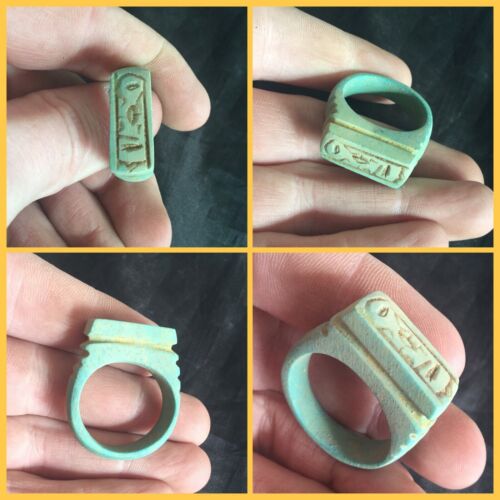 Title (ebay affiliate link): Rare ancient Egyptian blue faience hieroglyphics amulet Ring , 300 bc