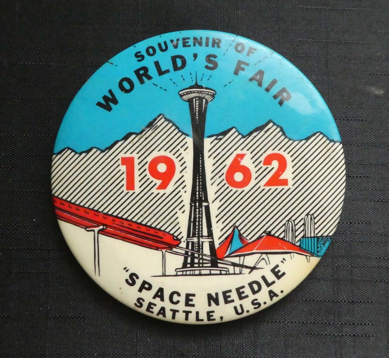 VINTAGE 1962 LARGE SOUVENIR BUTTON OF SEATTLE WORLD''S FAIR SPACE NEEDLE