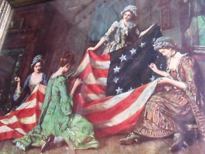 Lovely Vintage Print of Ladies Making 13 Star US Flag in Antique Wood Frame