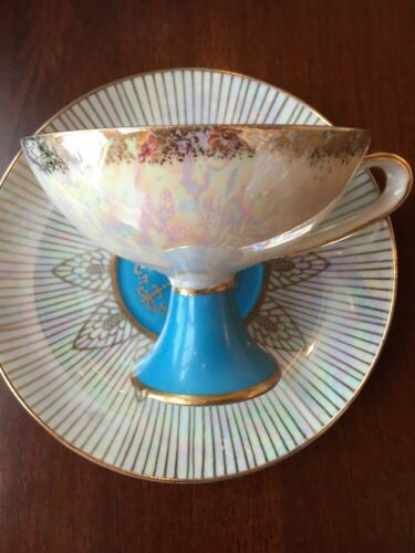 Royal Halsey Lustreware Teacup and Saucer. White Peacock Blue Gold Trim. Beauty!