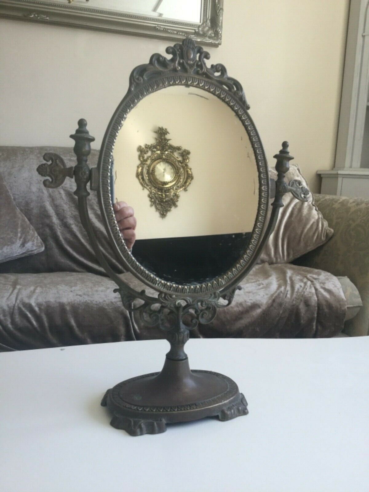 Title (ebay affiliate link): Vintage Brass Framed Oval Dressing Table Mirror Tilting Decorative Scrolled