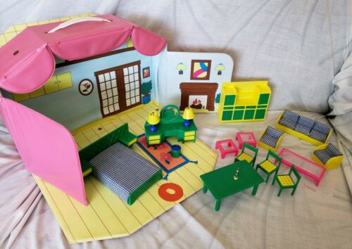 Title (ebay affiliate link): Vintage Tote-n-Play Glamour Gals Fold Out Dollhouse/Case With Furniture