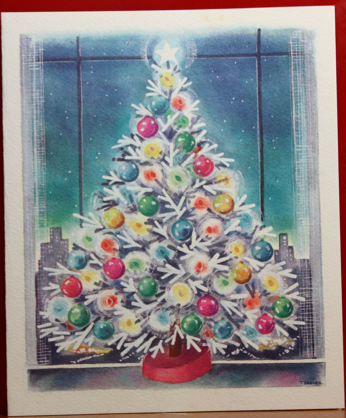 1949 Tessier Christmas Card Vintage Tree with Ornaments Window City Background