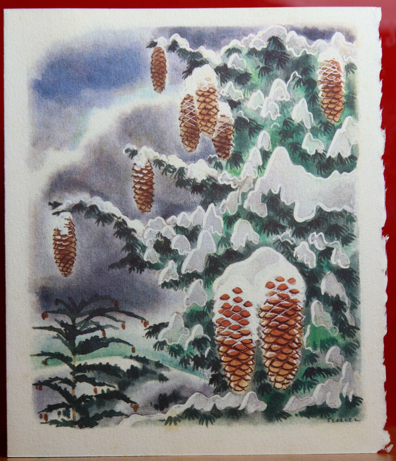 1949 Tessier Christmas Card Vintage Snow Covered Pine Tree Cones Woods