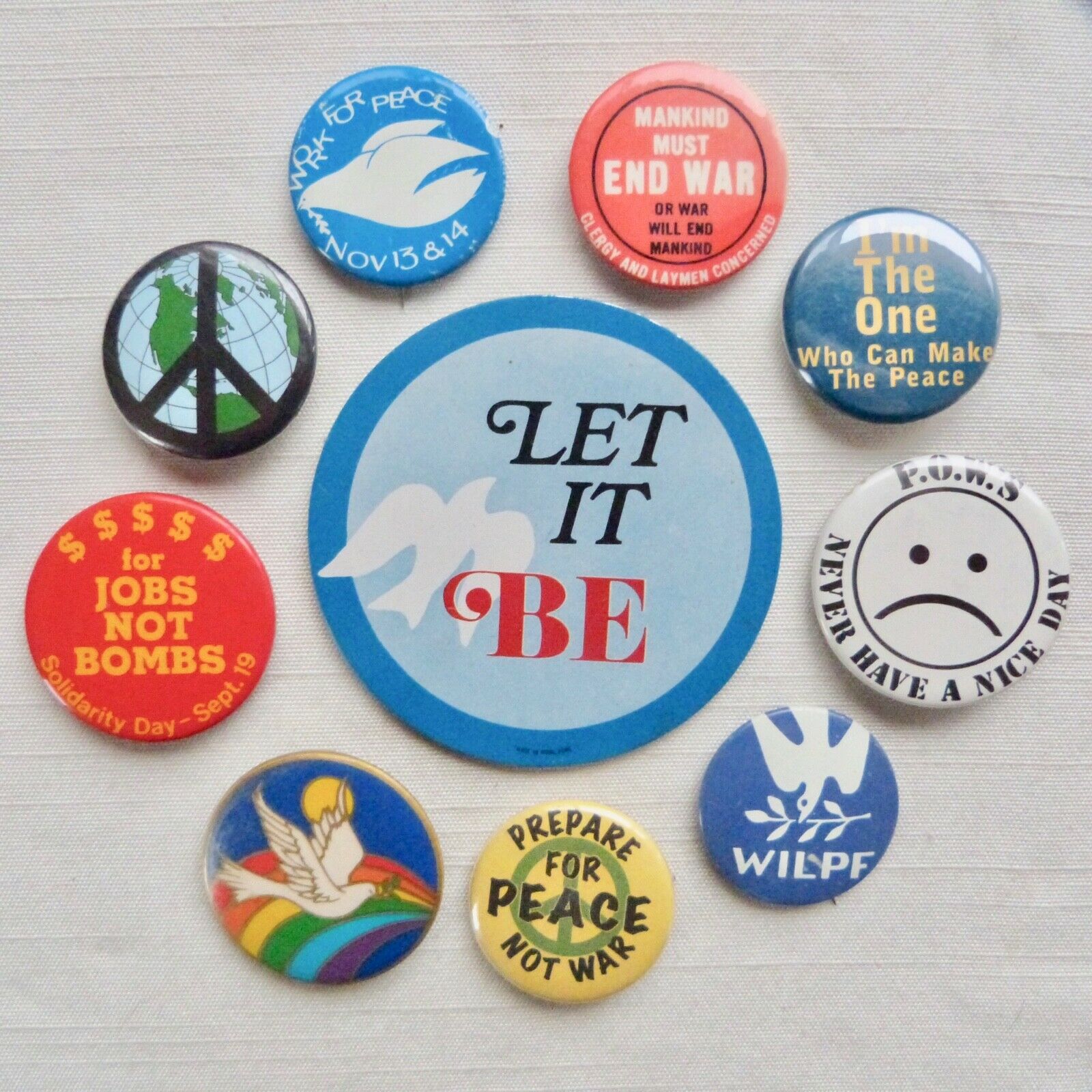 Lot of 10 peace / antiwar pinback buttons