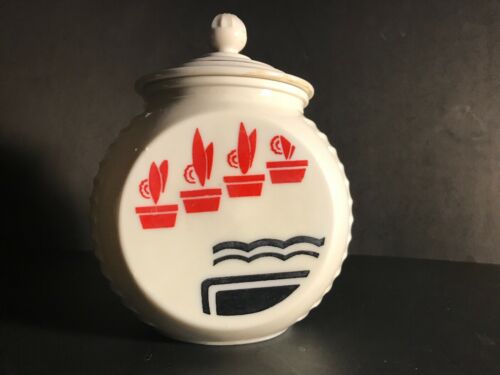 Vintage 1940s Hocking Vitrock Milk Glass Red Flower Pot Grease Jar Fire King