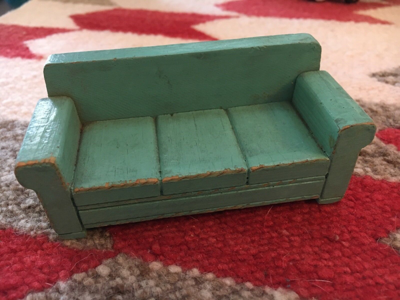 Vintage Doll Furniture Wooden Green Couch Antique Wood 4 inch
