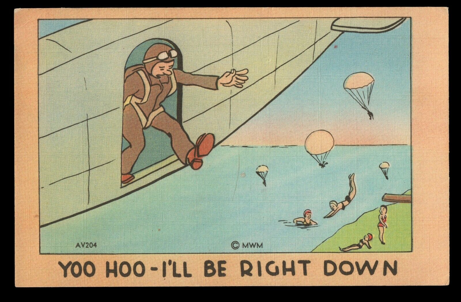 Title (ebay affiliate link): WWII Comic Postcard - YOO HOO - Paratrooper Parachuting to Women on Beach