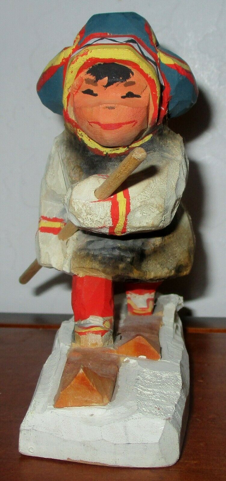 HAND CARVED WOOD SKIING BOY HAND PAINTED FIGURE