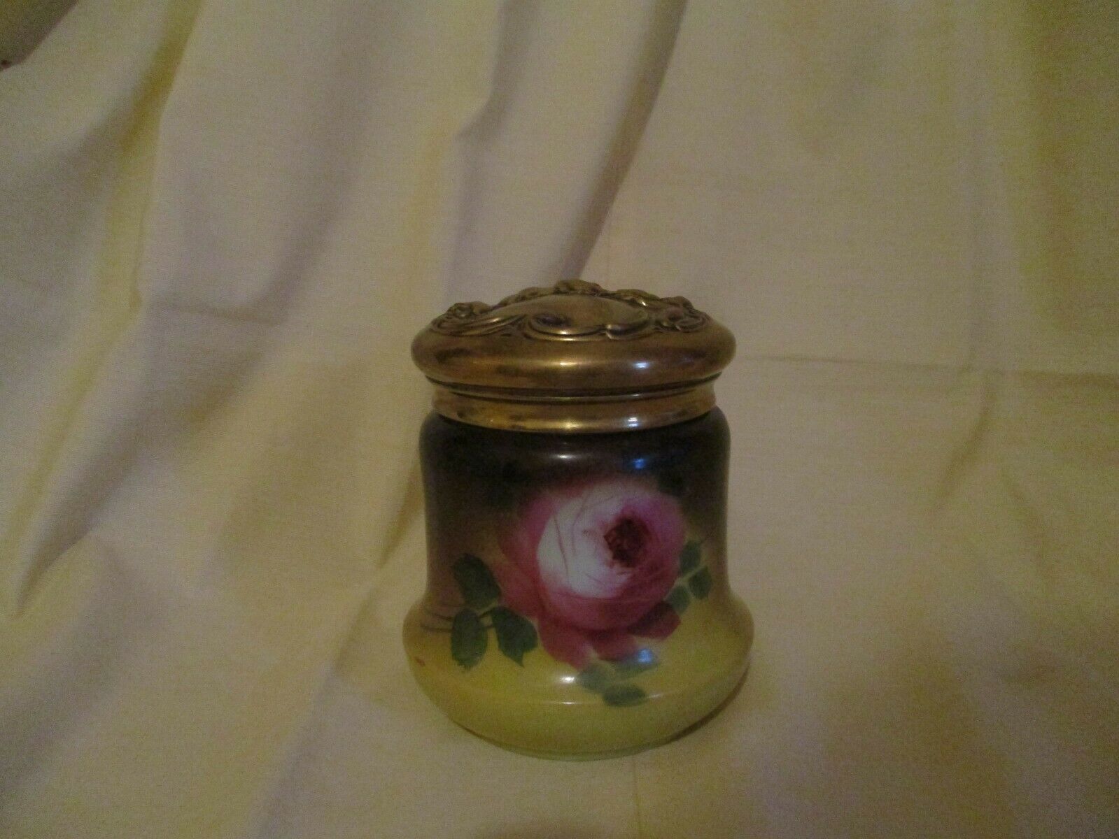 Vintage Hand Painted Milk Glass Tobacco Jar with Rose Decoration & Brass Lid