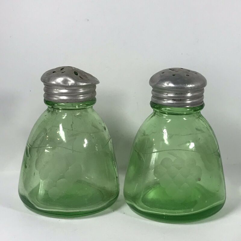 Title (ebay affiliate link): Vintage Hand Blown ? Etched GREEN DEPRESSION GLASS Salt & Pepper Shaker Set