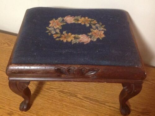 Title (ebay affiliate link): VINTAGE Carved WOOD Foot Stool Ottoman Floral Needlepoint Vintage