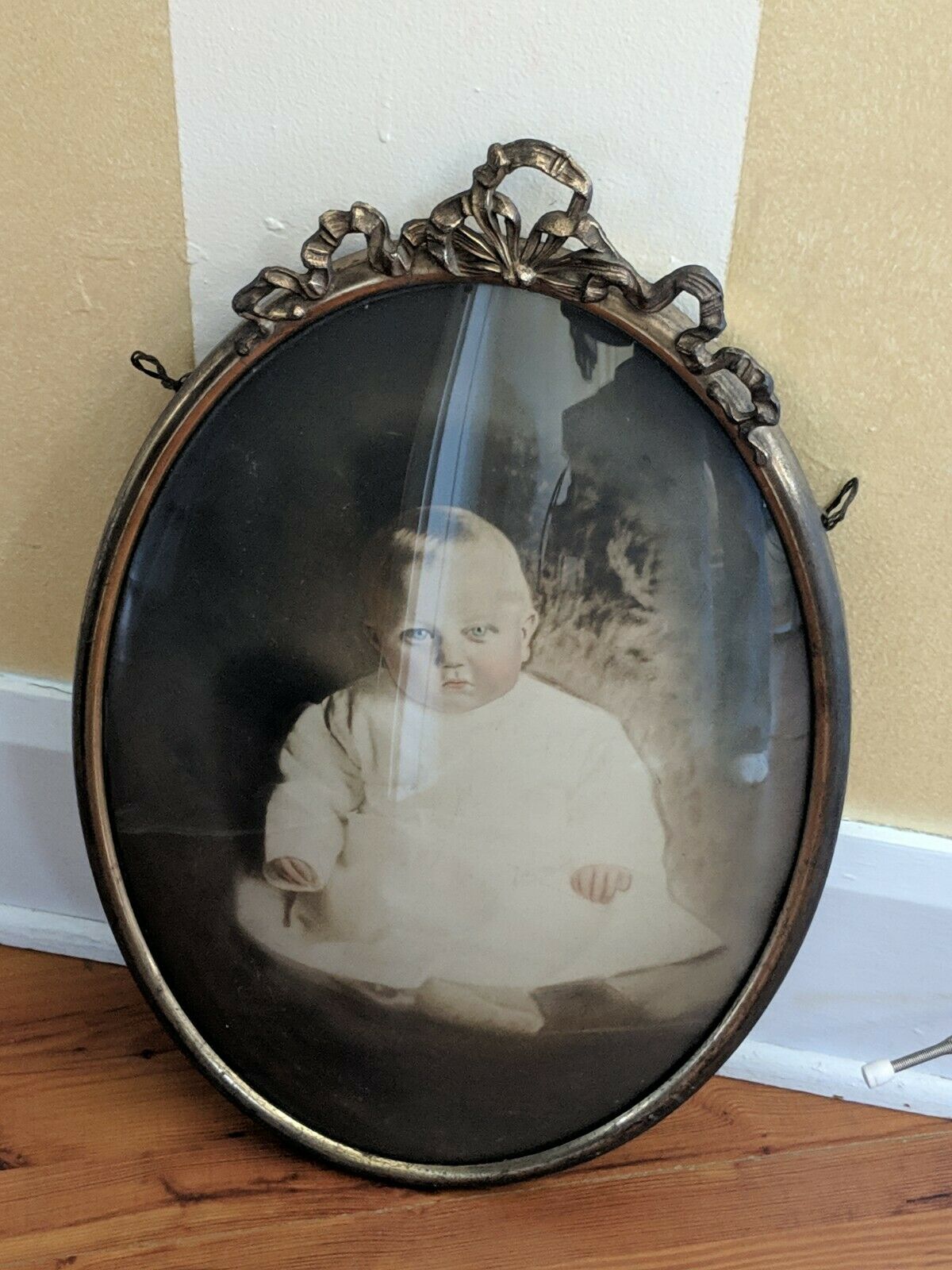 Title (ebay affiliate link): Vintage Metal Framed Baby Picture Oval Convex Bubble Front Ribbon Top 15x20