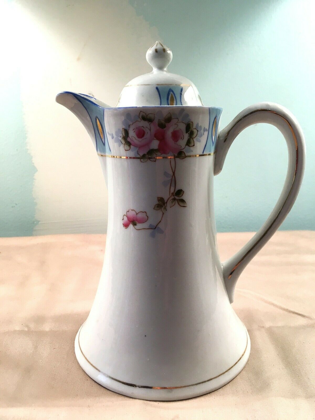 Title (ebay affiliate link): ANTIQUE PORCELAIN CHOCOLATE POT HAND PAINTED RAISED STAR MARK 22K GOLD ACCENTS