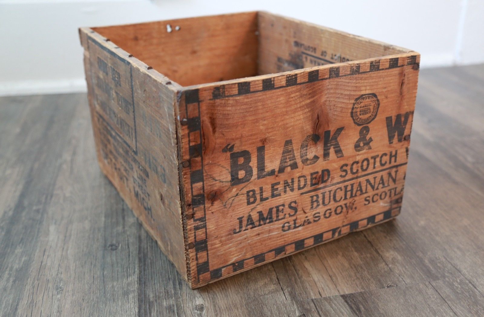 Title (ebay affiliate link): Antique Vintage Black & White Scottish Whiskey Wood Crate James Buchanan Glasgow