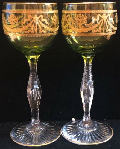 2 Vintage Tall Green Glass Goblets With Gold Swags (UU)