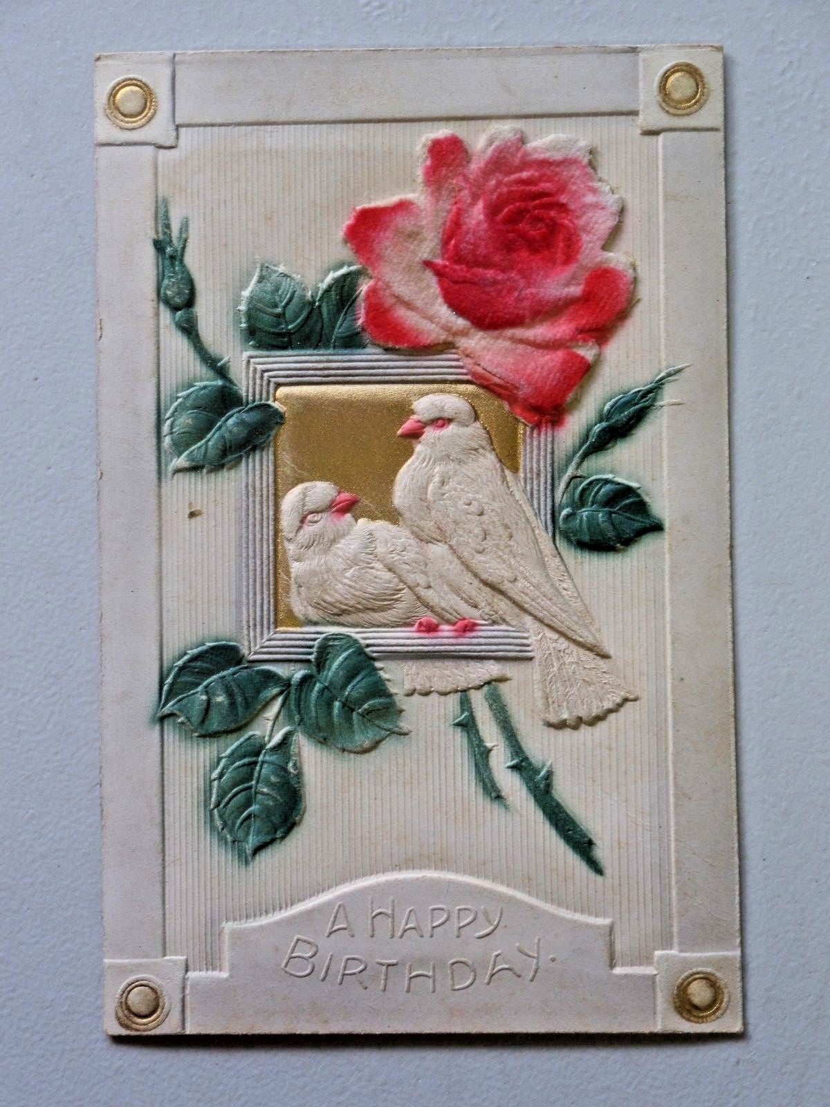 Title (ebay affiliate link): Vtg A Happy Birthday Heavily Embossed Birds, Flocked Flower Postcard 1170
