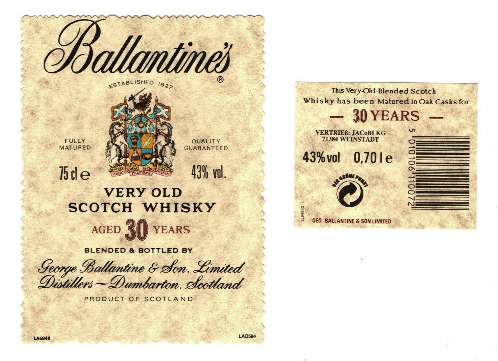 Title (ebay affiliate link): George Ballantine & Son. Dumbarton - 30 Yrs Old Whisky label + back - see scan