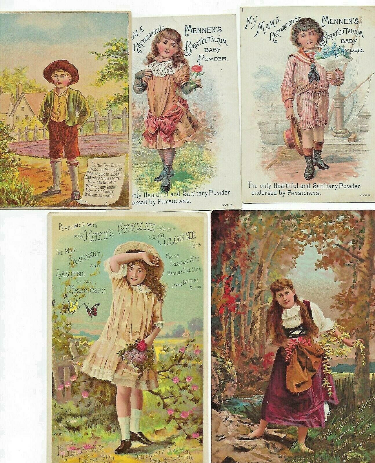 5 Victorian Trade Cards-1800''s advertising talcum powder, white teeth, cologne