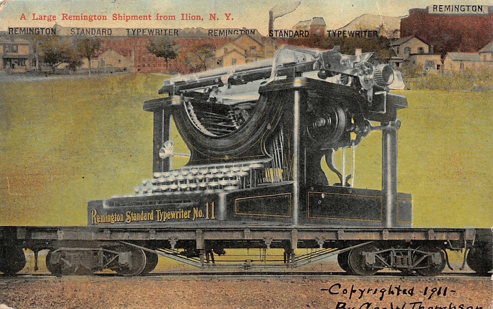 Title (ebay affiliate link): Ilion, NY-Huge Fantasy Remington Typewriter on Rail Car for Delivery