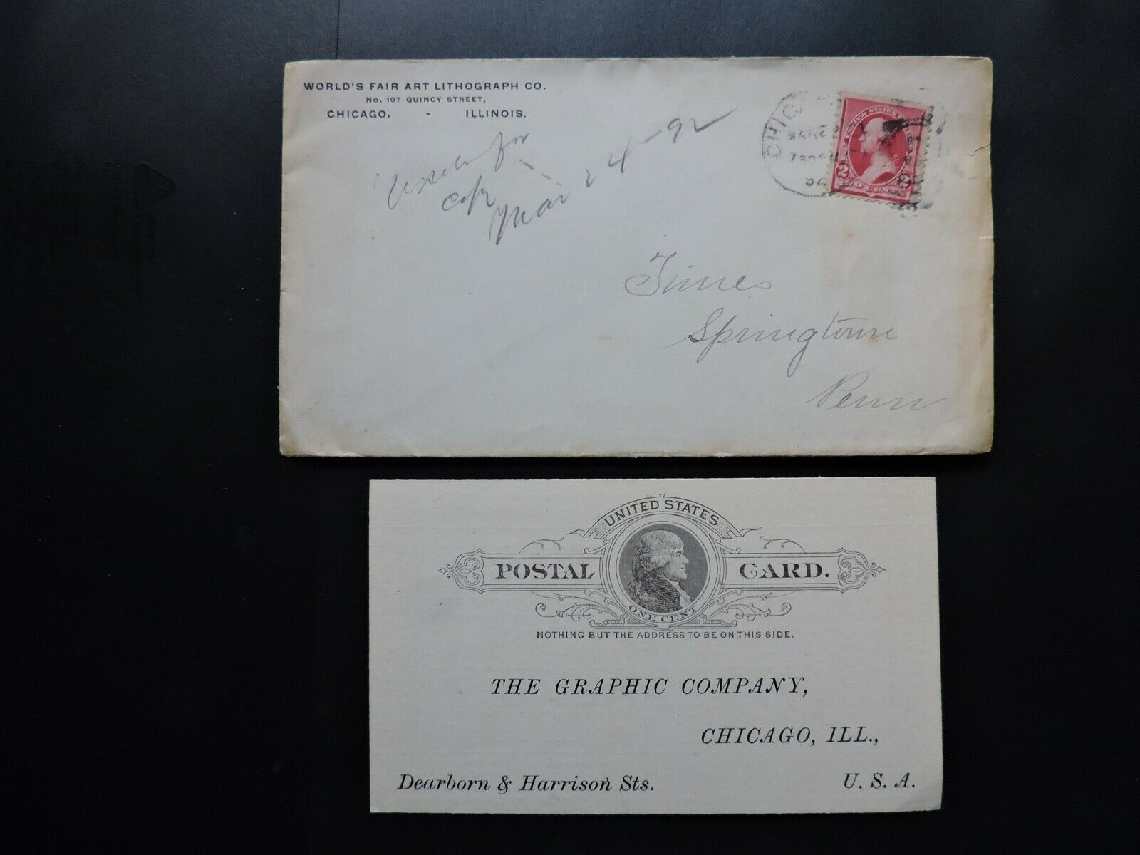 1893 CHICAGO IL WORLDS FAIR ART x2 ! LITHOGRAPH CO AD COVER+POSTAL CARD MAGAZINE