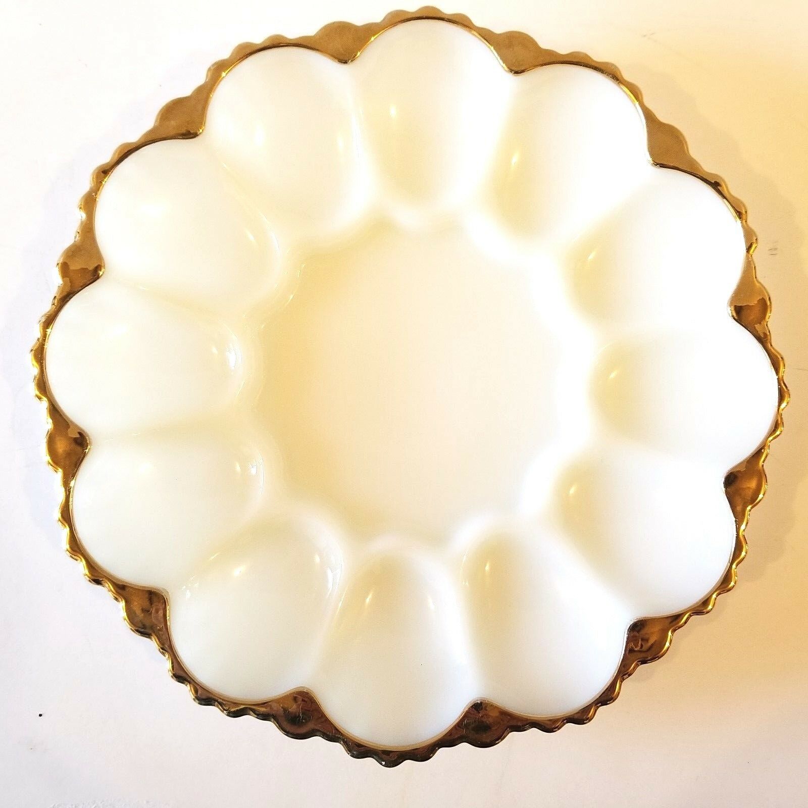 Title (ebay affiliate link): Vintage Anchor Hocking White Milk Glass Deviled Egg Oyster Serving Tray Gold-rim