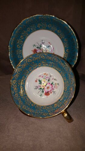 Staffordshire Teacup and saucer turquoise with gold and floral print. England