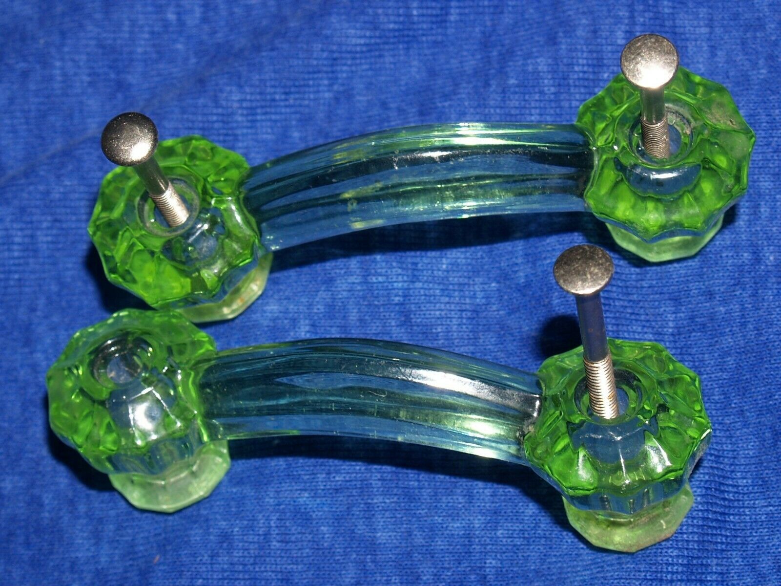2 Vaseline Green Depression Era Glass Cabinet Pulls Drawer Handles