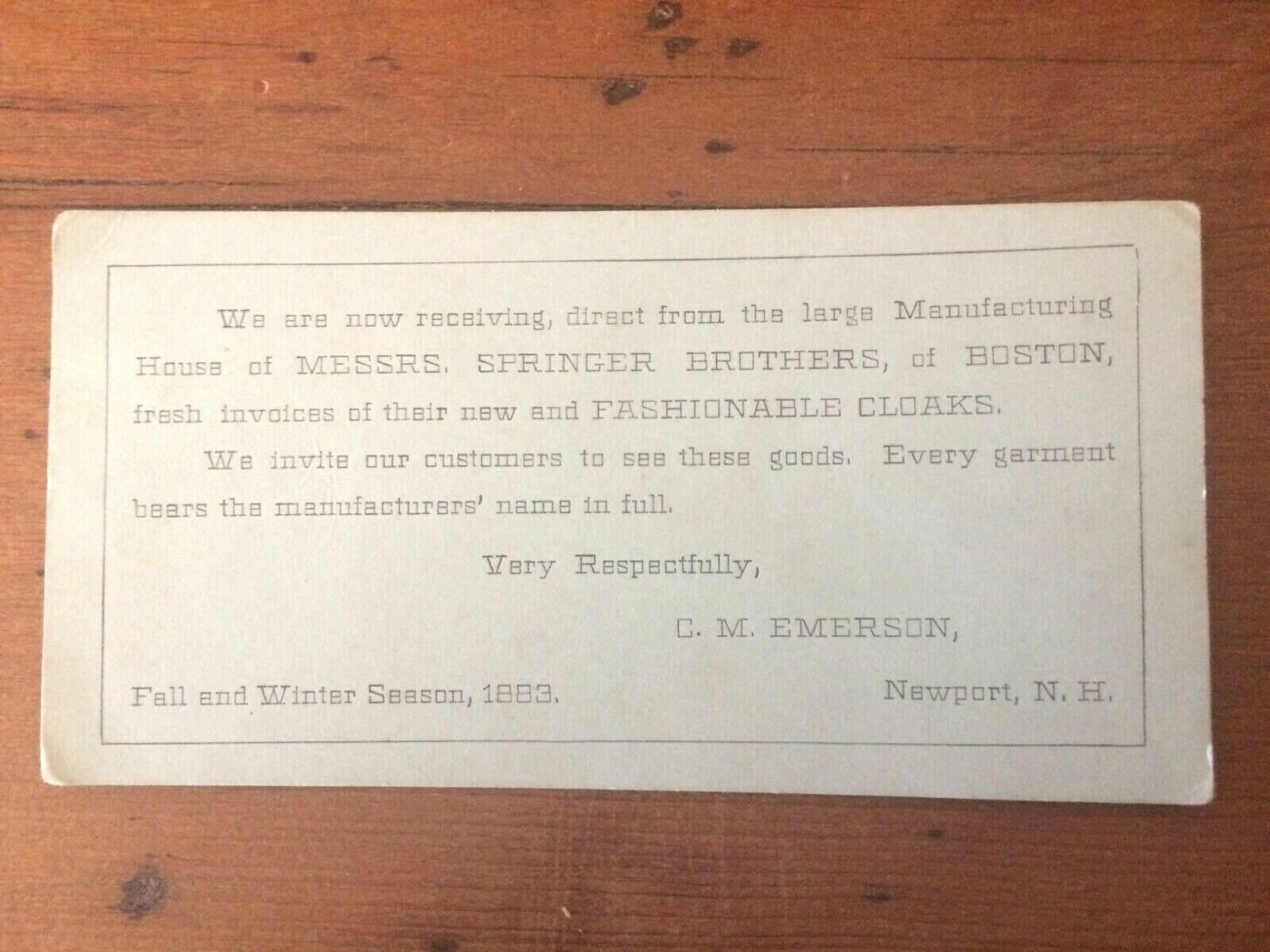 C.M. EMERSON FASHIONABLE CLOAKS NEWPORT NEW HAMPSHIRE 1883 business card