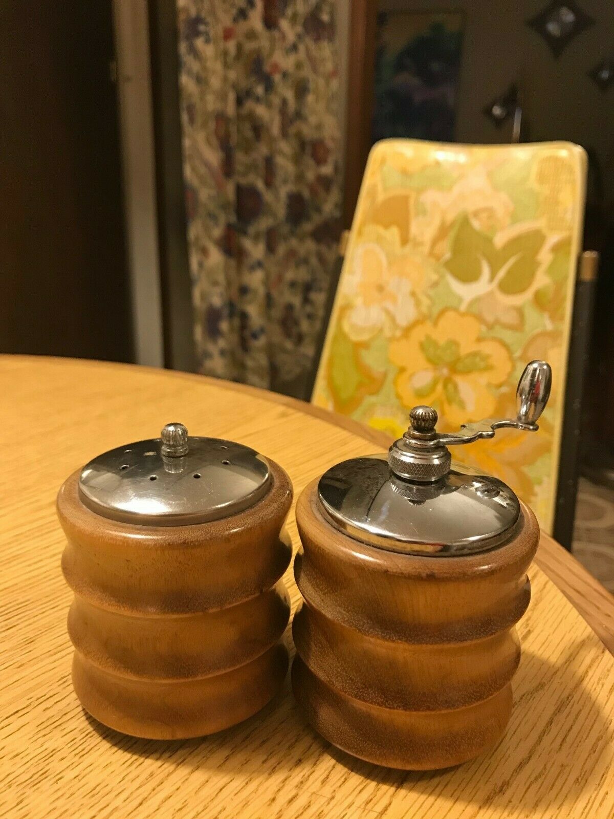 Title (ebay affiliate link): Vintage MCM Wood Barrel Salt Shaker and Pepper Grinder Los Angeles Patent Pend