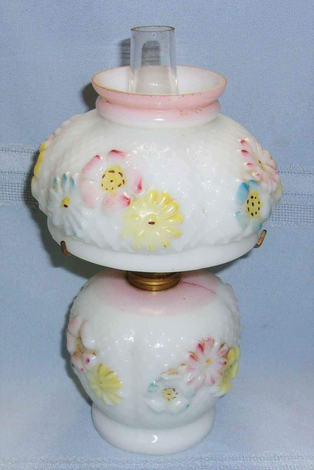 Title (ebay affiliate link): MINIATURE FLORAL PAINTED MILK GLASS GONE WITH THE WIND STYLE OIL LAMP W/GLOBE-VG