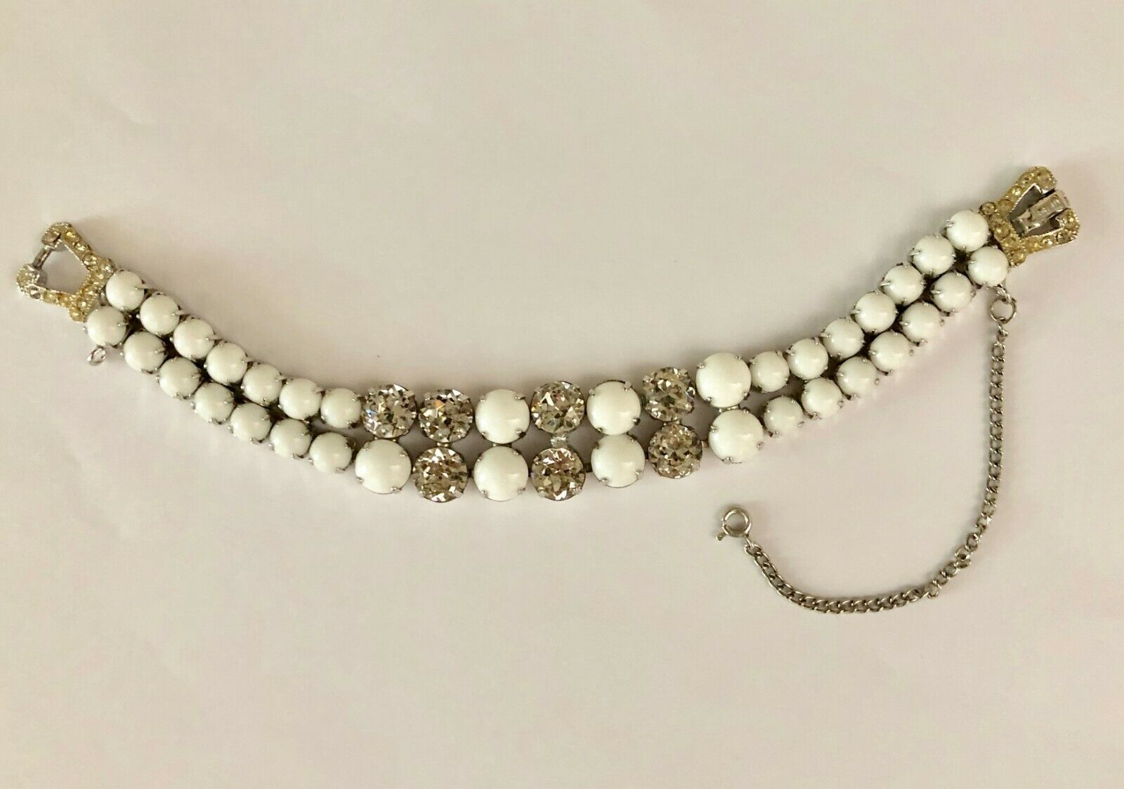 Title (ebay affiliate link): VINTAGE WEISS LARGE RHINESTONE MILK GLASS CABOCHON BRACELET w/ SAFETY CHAIN