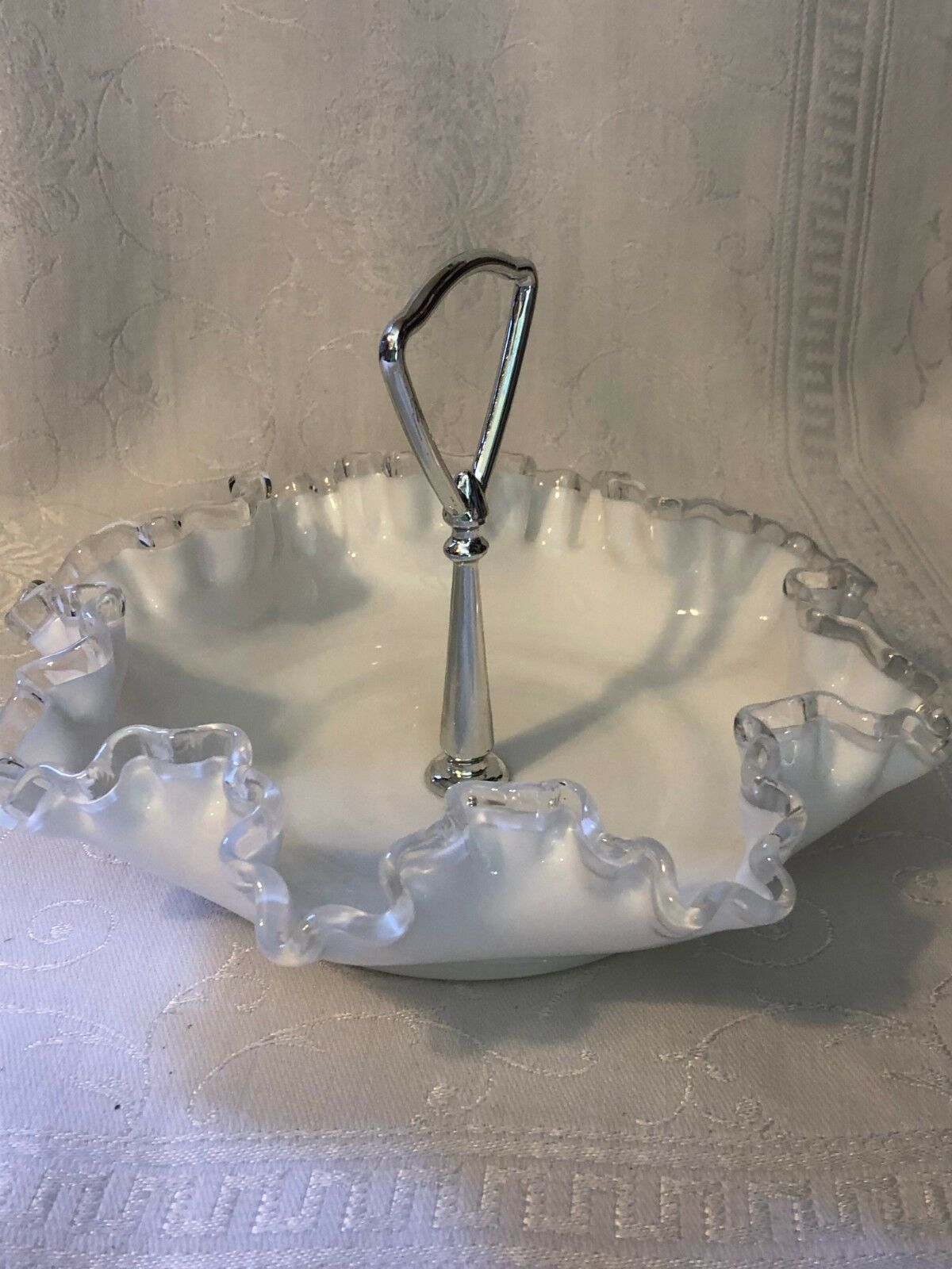 White Milk Glass Handled Candy Dish Bowl with Clear Glass Ruffled Rim Fenton