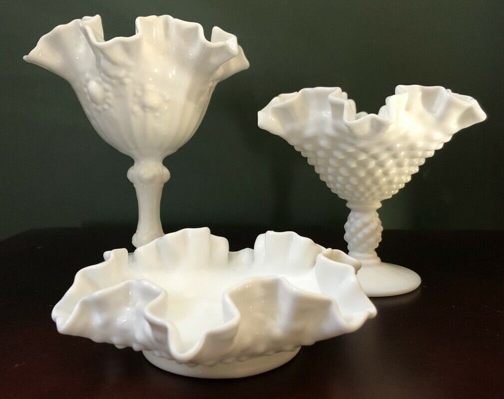 Title (ebay affiliate link): Vintage Fenton?3 White Milk Glass Fluted Candy Dishes- 2 Hobnail,1 Flower Pattrn