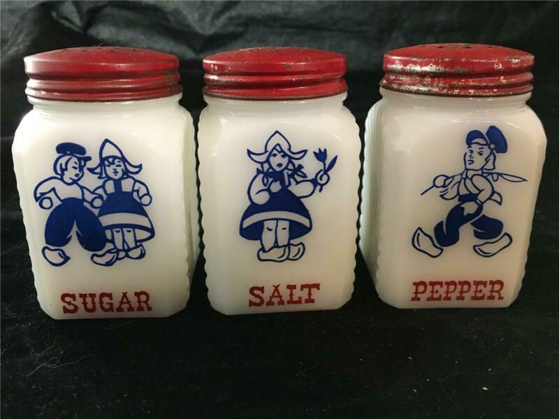 Tipp City Milk Glass Salt Pepper Sugar Shakers Dutch Scene