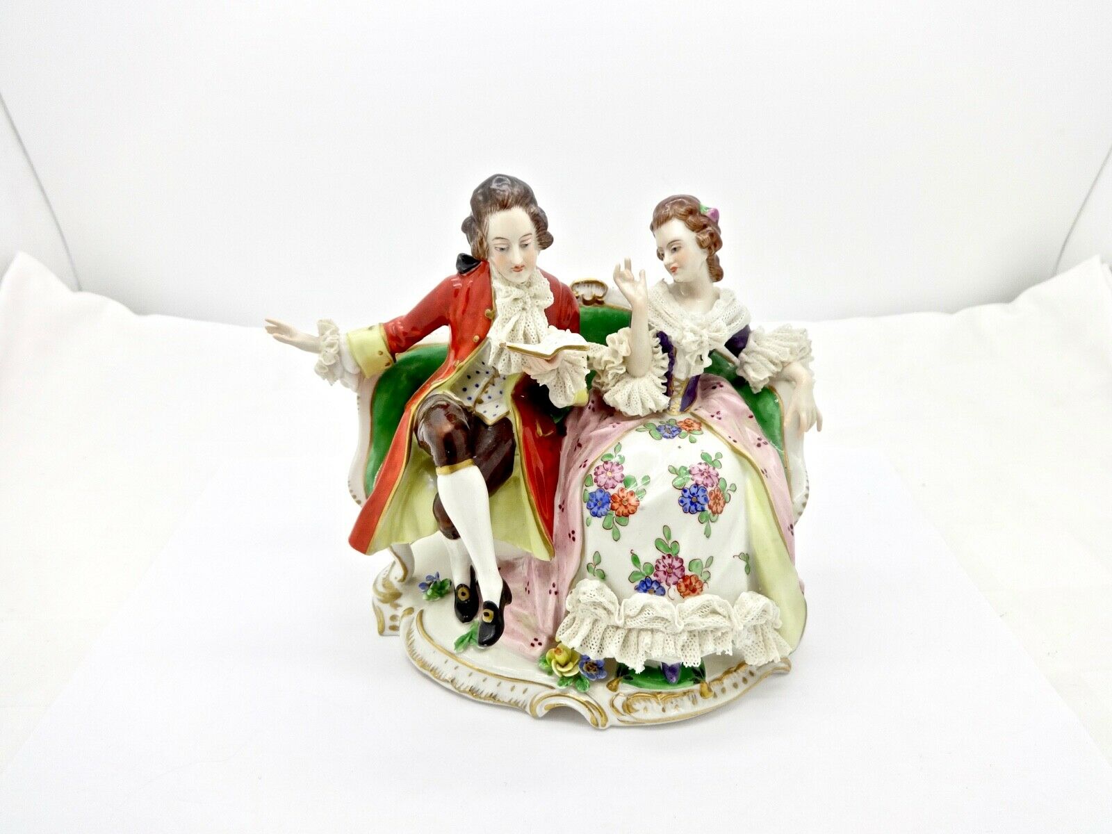 Title (ebay affiliate link): VINTAGE DRESDEN LACE FIGURAL PORCELAIN PARLOR SUITE,POEMS OF LOVE,COURTING