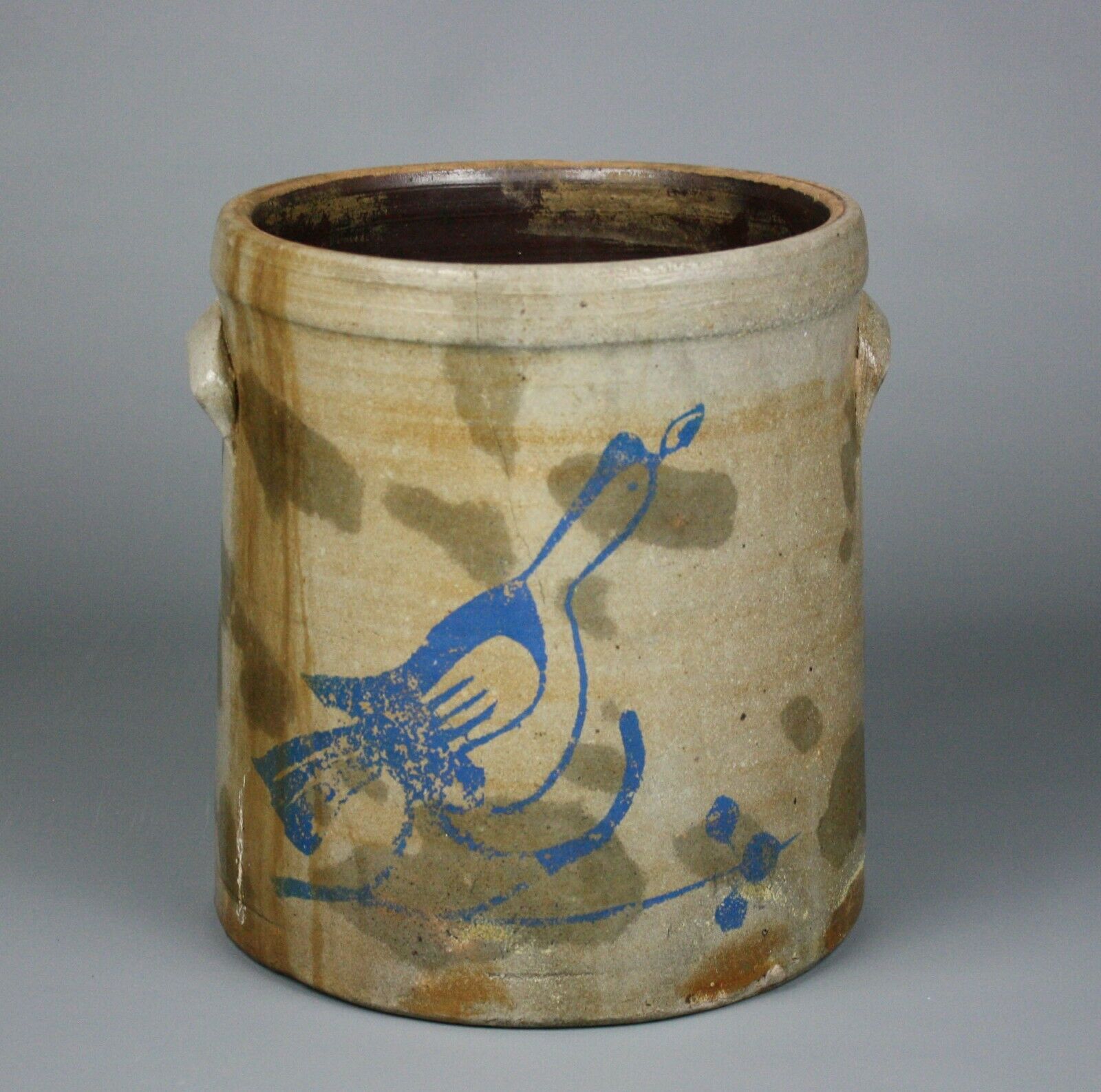 Antique Stoneware Crock, Blue Bird Motif, Three Gallon, Handles, 10 1/2"