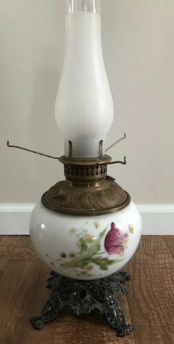Title (ebay affiliate link): Antique OIL LAMP Milk Glass w/Hand Painted American Eureka Lamp Font Burner
