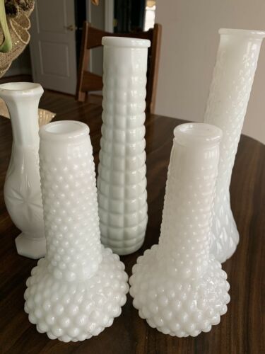 Title (ebay affiliate link): 5 Vintage Hobnail Milk Glass Bud Vase White Diamond Flared Bottom Flower Square