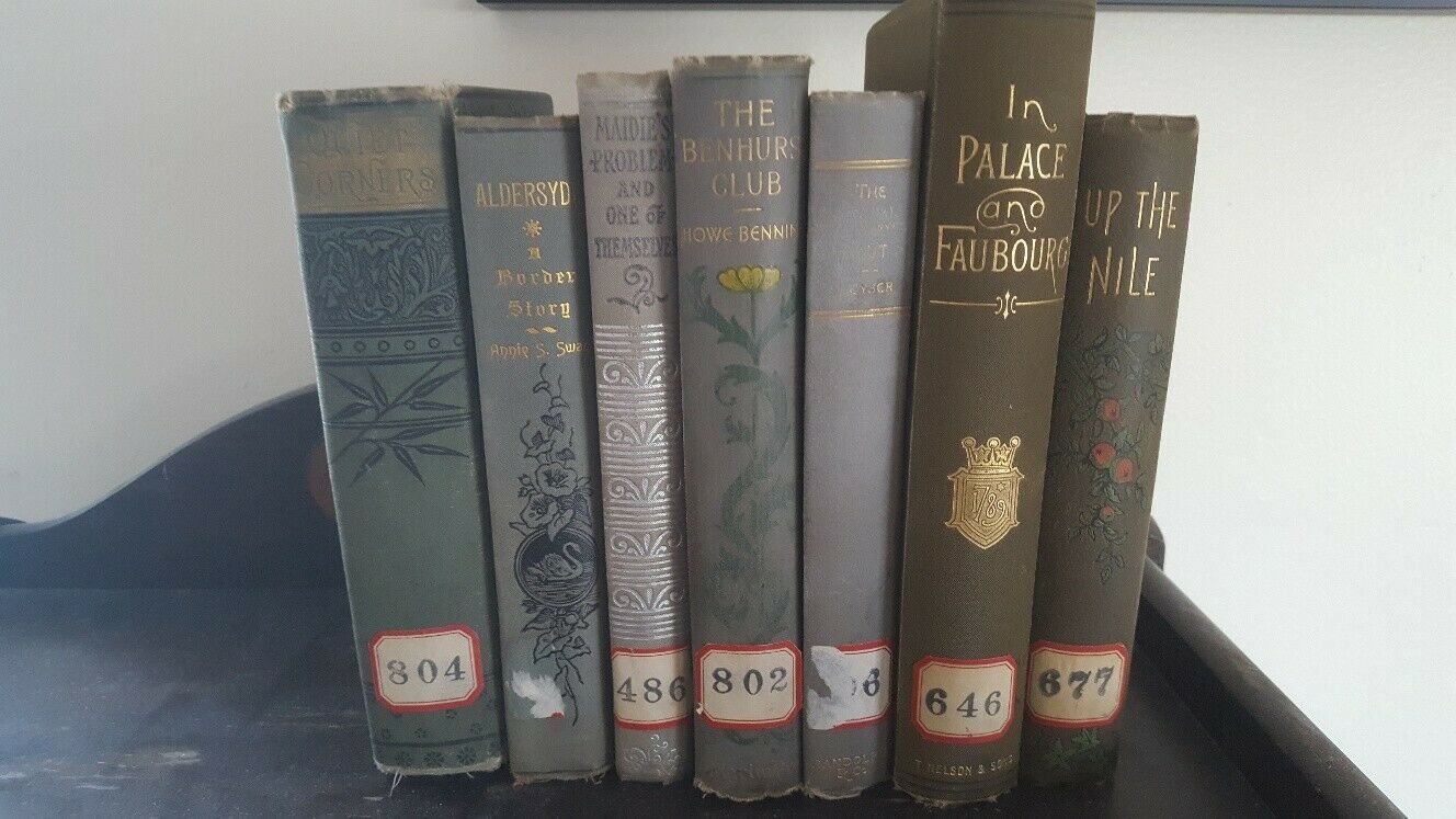 Title (ebay affiliate link): Lot of 7 Gold, gray, & olive early 19th Century Vintage Decorative Antique Books