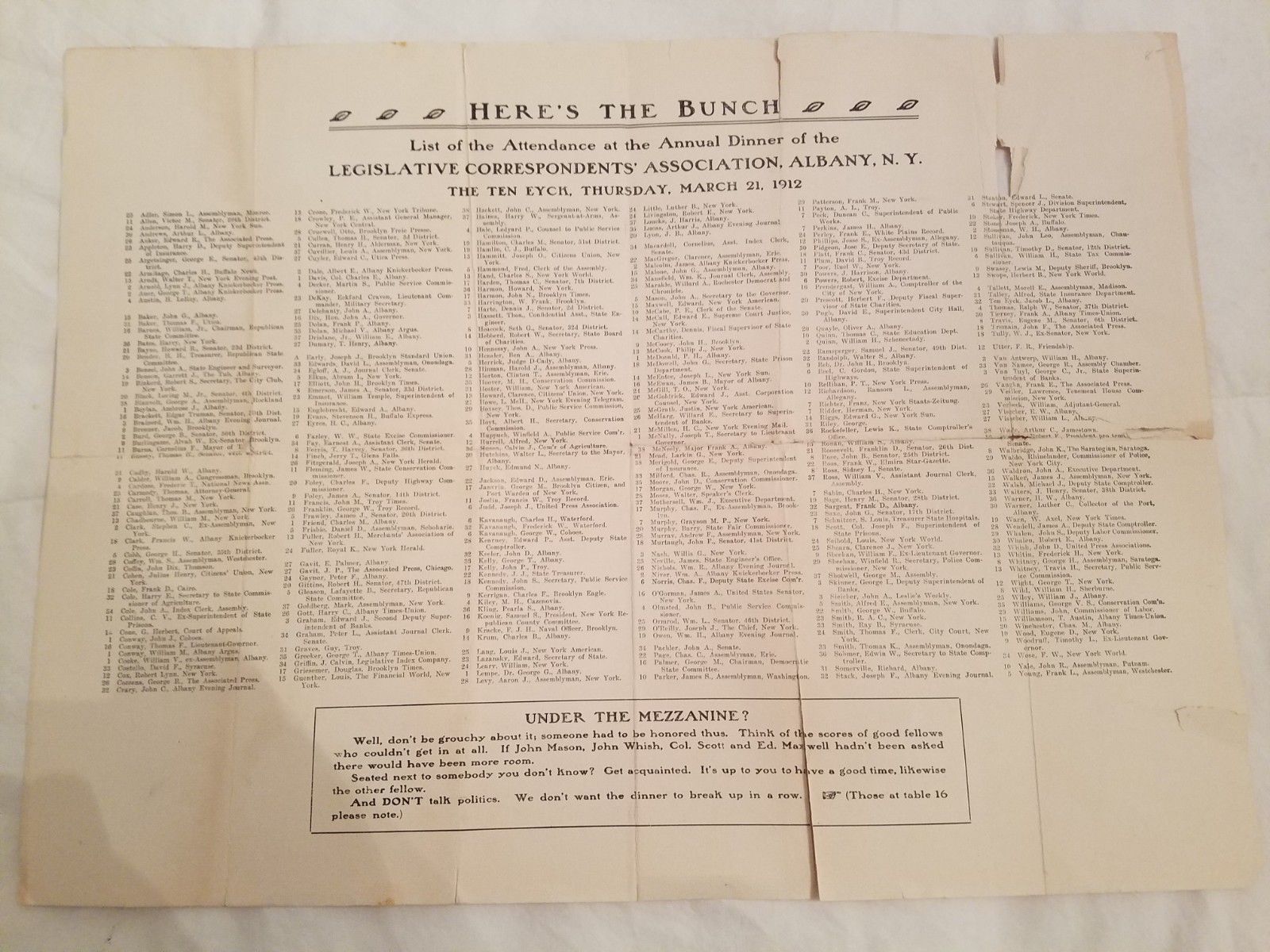 NY State Legislative Correspondents'' Ass DINNER 1912 AL SMITH, FDR, GOV. DIX
