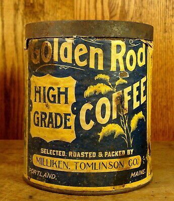 Title (ebay affiliate link): 1 lb. Golden Rod, Paper Label, Slip-lid Coffee Tin, Portland, Maine