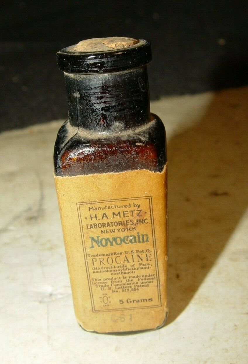 Estate Antique Advertising Metz NY Brown Glass Novacain Medicine Bottle # 22