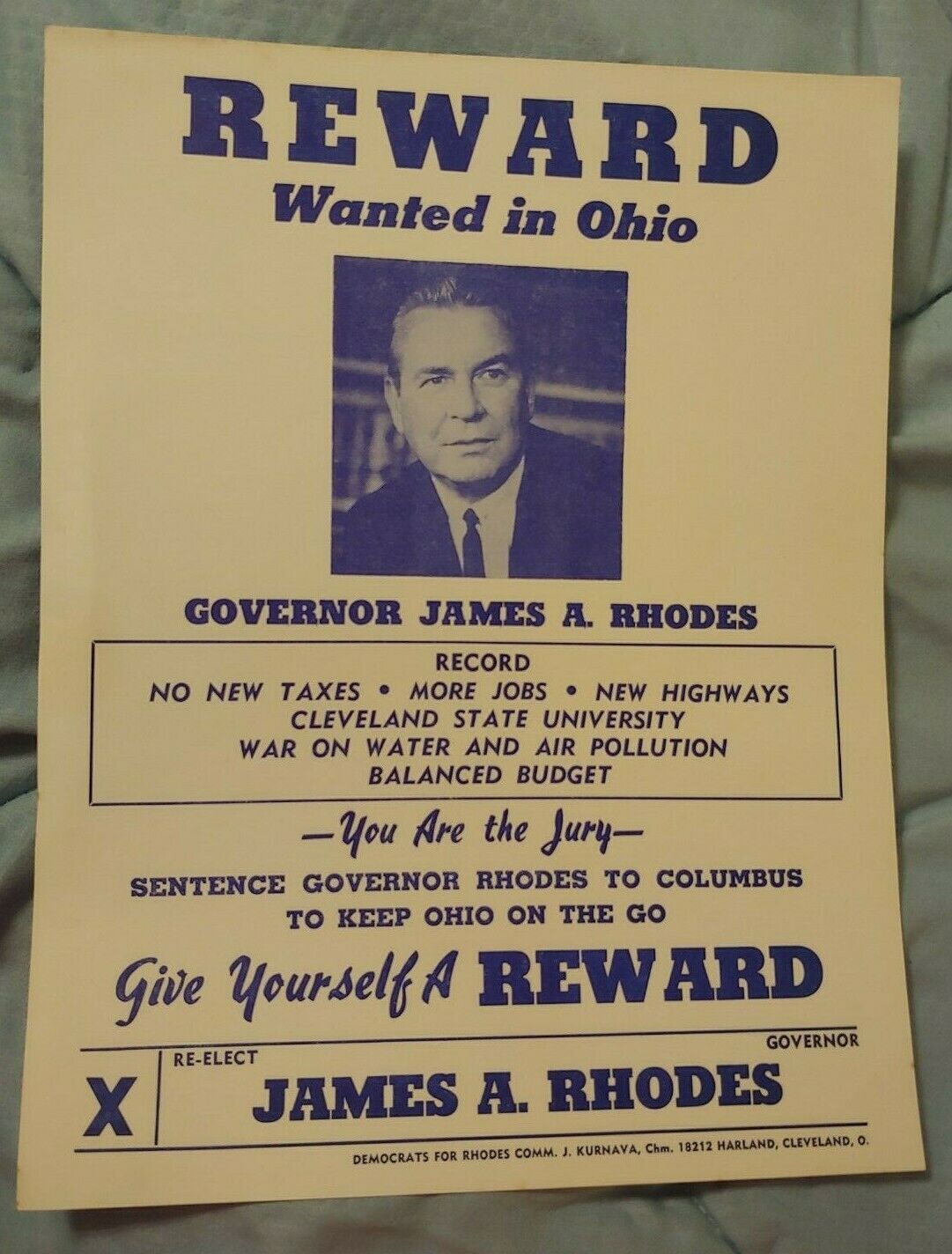 Title (ebay affiliate link): VINTAGE DEMOCRATIC POLITIClAL POSTER JAMES A RHODES OHIO REPUBLICAN