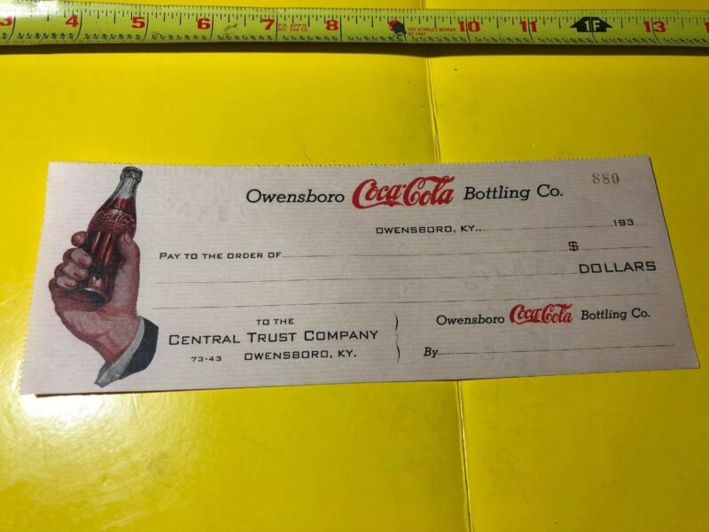 vintage Coca-Cola Soda Pop Owensboro Kentucky unUsed Check 1930S
