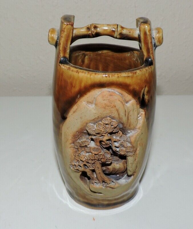 VINTAGE POTTERY WISHING WELL VASE WITH CARVED OUT TREES AND TEMPLE?