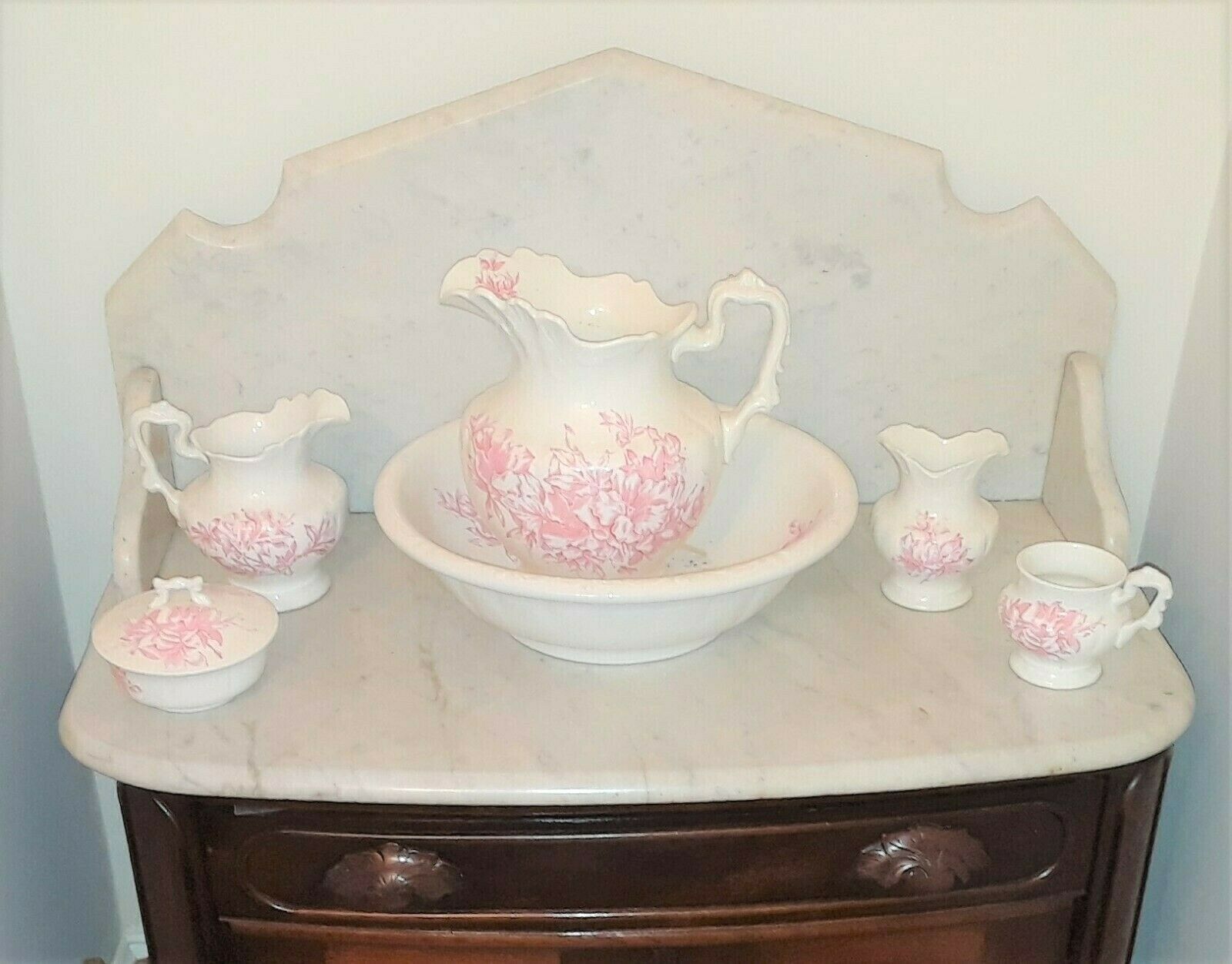 Beautiful Antique Victorian Floral Basin Pitcher And Wash Bowl 7pc. Set
